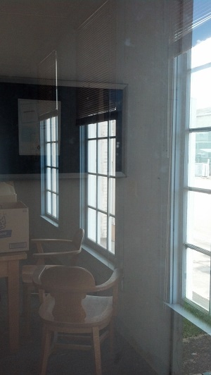 Looking in through the front door at the windows.  The interior is carpeted and the windows don’t extend down as far as I had originally thought (which is probably a good thing). Once the desk, chairs and boxes are moved to the other side of the room, there will be plenty of space to work in.