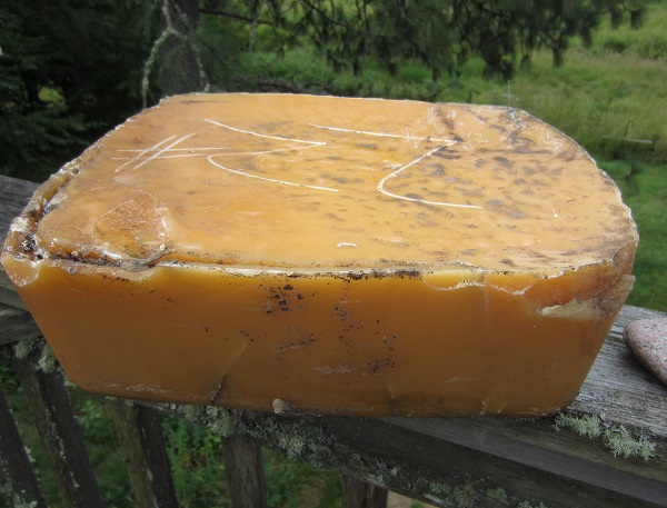 Friday I had a fun field trip south. First stop was at Queen Bee Honey, a local apiary. Their bee boxes travel around the mid-valley utilizing clover, meadow foam, and other fields for honey production.  Many boxes spend time around Brownsville and yes, even Halsey! That’s why I want the local stuff! My mission was to purchase wax, but in addition to the wax I received a wonderful tour of their facilities. A big thanks to Karen for hooking me up with so much beautiful wax. Interestingly, the honey harvested is consumed locally: restaurants and breweries being some of the biggest purchasers. If you would like a taste, they sell bottles at the Corvallis Farmers Market. Below is my 22# block of wax: