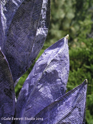 I finally have part of sculpture #4 wired up but I’m still working on the individual flower parts. This particular camas was created from a dictionary. Our heat has been a tad high (95F or 35C) which certainly makes the sculpture parts dry quickly when placed outside. The clock is ticking and I’ll be lucky to plunk out another 4 camas plus backdrop before the installation date of September 1. Then there are a few weddings to attend and various other engagements. I think Halsey will have to be happy with 8 (or 7) completed stalks.
