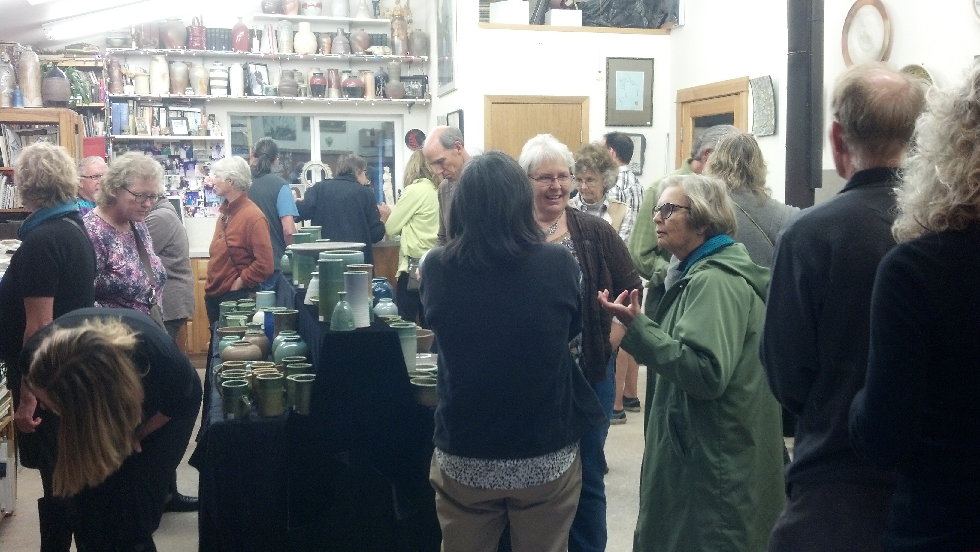 We all had a blast last night visiting the first half of studios on the Philomath Open Studios pre-tour. Thursday night will cover the second half of studios. I ended up snagging a few images from my friend Cynthia Spencer who was smart enough to be taking photos along the way plus others taken by Mike Bergen and a few by me. Below: Judith Sander and I checking out Rhoda Fleischman’s beautiful ceramic work (with Kate McGee’s incredible pastels behind us). Makes me want to dip my toes back into the world of mud! Rhoda is the guest at Kate McGee’s studio. I wanted to purchase one of Kate’s works, but my friend Debby snagged it before me. You have to be quick with other artists around!