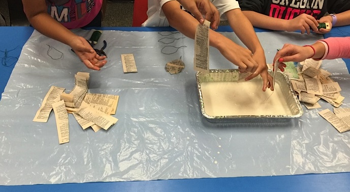 Below are a few photos passed along from a project through Central Linn Elementary school thanks to Jessi Furlo & Cheryl French, part of the education outreach staff at The Arts Center. Jessi attended my artist talk and took the inspiration and ideas from that into the classroom. The kids worked with wire and book pages to create forms for their tree. Someone built them a very nice stand to support their sculpture. It looks like the kids all had a great time. I have to say it’s pretty cool to have inspired a great group of budding artists!