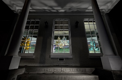 This morning I receive an incredible photo from my friend John Ritchie. He is a photographer in Corvallis who has an amazing perspective on the night. He prowls around town taking street and alley photos during all weather and season. I first met John during the “Artists @ Work” installation in 2011. As one of the regular visitors over the month long project, it was always a pleasure to chat and learn more about his work while sharing my developing sculpture. He and a friend made a trip to Halsey to view the Camas installation before the removal. He sent me the above image. WOW!! I love the fact that the front step inscriptions were captured along with the dramatic columns. Such a great image to have in my collection. Please click on John’s name above to reach his website.