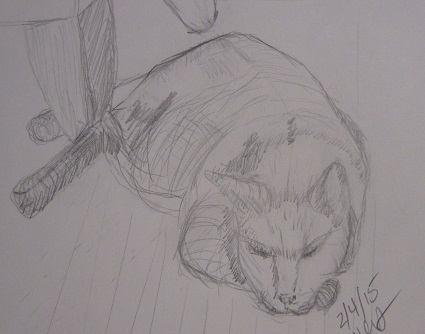 Today’s sketch is of Nigel. I never draw the cats, so I’m not as confident working with their angles (and in Nigel’s case, the overly plump belly). It’s a Eugene day, so I don’t have the time to spend really looking at all the important parts. So it’s a quickie. I can say I did something today in the art world. Off to deal with my brother for a while. Urgh! I’m tired of that whole scene. Vacation time can’t get here soon enough!