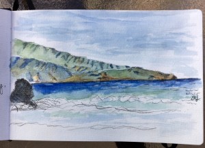 Monday was an exploration day, searching out a good snorkeling location. We spent a bunch of time exploring Dragons Teeth out at the end of Kapalua. Beautiful location,if you can ignore all the resort/ golf course end of things. After Kapalua, we traveled farther north on hwy 30, ending up at the Blowhole. There we were fortunate to find an incredible humpback whale display we couldn’t pass up. After watching the group of 5-6, we backtracked to a different beach, populated by locals. Dave spent some time in the water while I pulled out the sketchbook for a quickie. The island of Molokai rests 7-10 miles across the channel. I only captured a very small tip of it. So many ridges and shadows! Landscapes are not part of my drawing routine. I picked up a few odds and ends on the beach and hope to do a few sketches of them later. The weather is looking good thus far! A few showers in the mix but it shouldn’t cause us much problems.