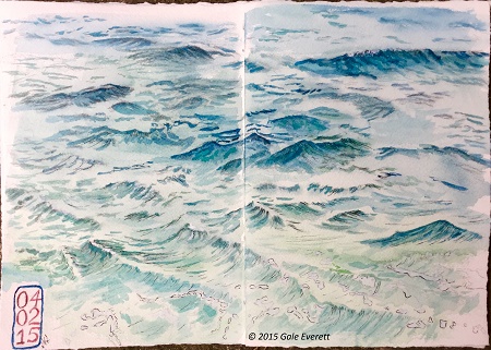 Full page spread of waves/water at the shoreline. The color is off in this image, missing more blues and greens. That’s always a problem, trying to capture colors accurately. Taking photos outside on cloudy days creates for different colors captured.