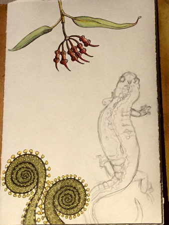 2. One of the things that is so interesting about those books is the choices we make of subject matter – the salamander has settled right in, the patterns on his (her?) body becoming part of the concept. Very nice! Its hard to conceive of your heatwave – here is is clear and sunny but very cold (cold for Sydney anyway, 13C in the middle of the day!)