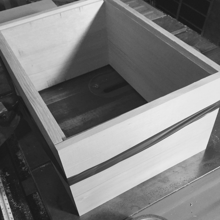Slowly it’s coming together. A bit more fidgeting required to accommodate the cut tree ring panel.  I’m so glad to have the bench router as part of the tool collection. It worked like magic once I figured out how to use it. Hopefully the cases will be glued up and dry by Sunday afternoon. There will be plenty of sanding and staining to accomplish, plus finishing the back access door and lightning.