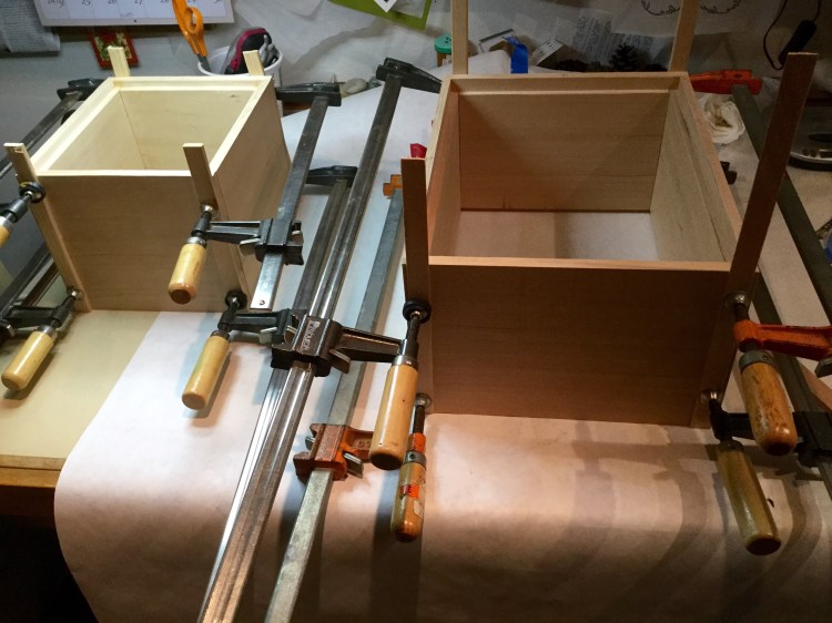 I’m finally on a roll with the cases. The initial small case ended up in the junk pile due to bad cuts. Fortunately, I had more wood and the second round went smoothly. Now the cases are drying with clamps secured. Monday morning I’ll start working on the next portion of the finishing.