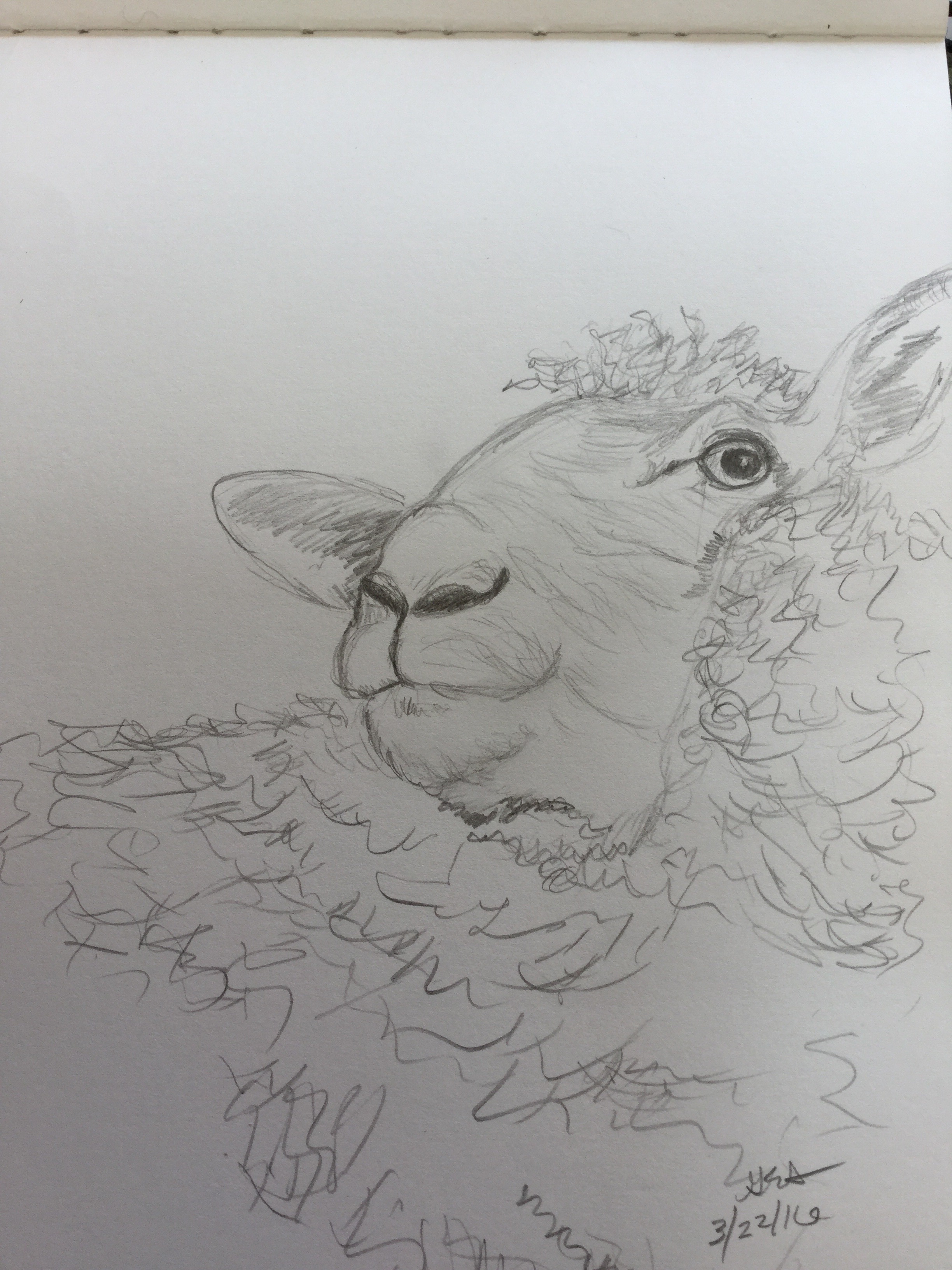 I spent more of my night coughing and awake than asleep. I’m still recovering from a horrendous respiratory infection that started about 2 weeks ago. Rather than going to Eugene today, I figured another day of rest was a wise choice. I thought a quick sketch of the mama sheep from Sunday was an appropriate subject. The sheep might show up in a print once I feel better acquainted with the form. Possibly more sketches to come, larger and in charcoal….