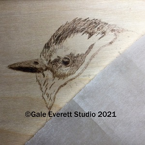 Here we go with a second round of bird wood burning/ drawings. This is a Townsend’s Warbler, a very active bird around my area. I’m working from a photo that I took last February during the same ice storm as the Chestnut Backed Chickadee. This little male has a lovely profile but his tail end is actually facing me. I’ll be attempting to get all those delicate fluffy feathers and strong wing and tail working in an appropriate manner. Time will tell! I have lots of burning ahead.