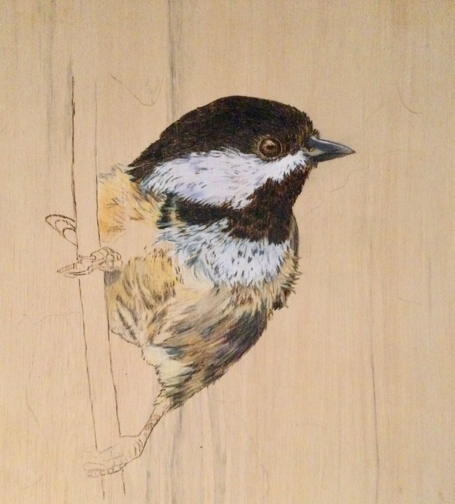Work In Progress: Black Capped Chickadee . Pyrography, colored pencils on plywood.