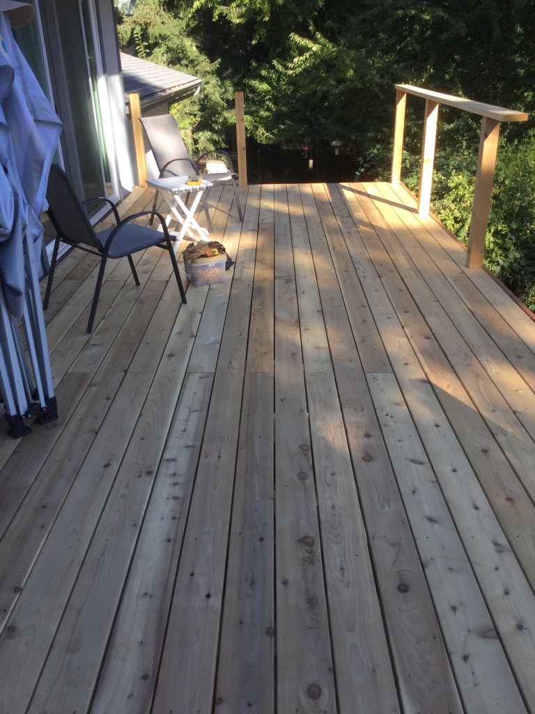 1. At least the decking is finally completed as of today ( we still had a row plus a narrow strip to install. ) We have had fire weather plus major smoke from fires near Eugene (Oakridge where Evelyn worked). Not ideal working conditions, but we’re hoping Sunday will be a better day!