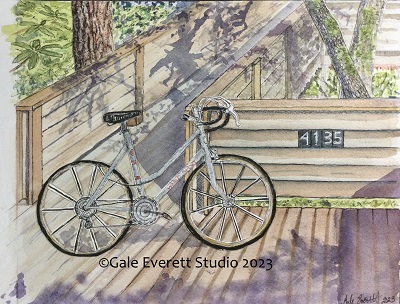 I’ve finally completed one out of 5 pages! This probably makes absolutely no sense to anyone except for the 4 other participating artists. Lets step back a bit. In 2015, I joined an existing small group of artists to create special , one of a kind artist books. In 2018 we added another member for book #2. We met via WordPress blogs and have continued to support each other over the years. Last spring/summer 2022, we decided to create yet another round of books. This time we opted to just send completed pages to each recipient rather than sending around the full books. The page completed is winging it’s way to Stockholm Sweden. The theme of Rebecca’s book was First Bicycles. I drew my first favorite bike, a Schwinn World Sport. We lived in hills so multiple gears was a must!