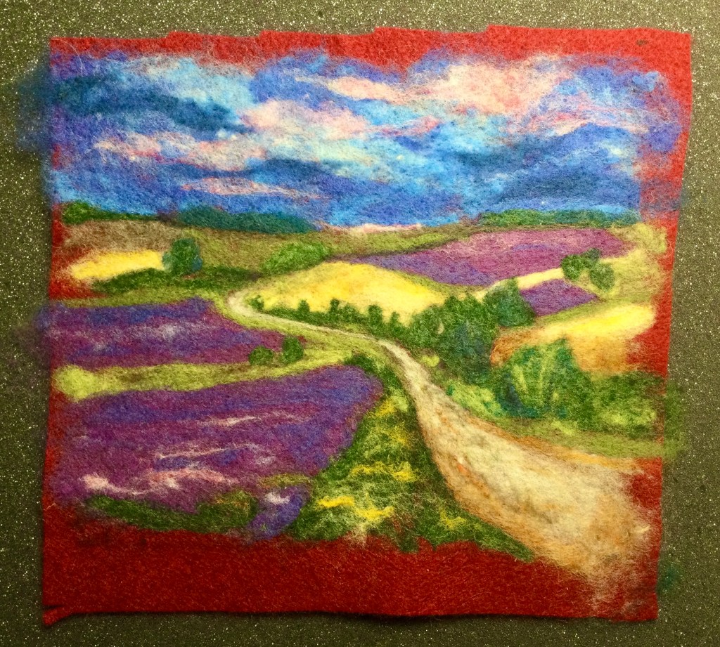 I’ve not had the clearest brain this week so I started it off with a bit of play on Monday. Felting in 2D. The finished image is about 5.5 inches square (14cm).