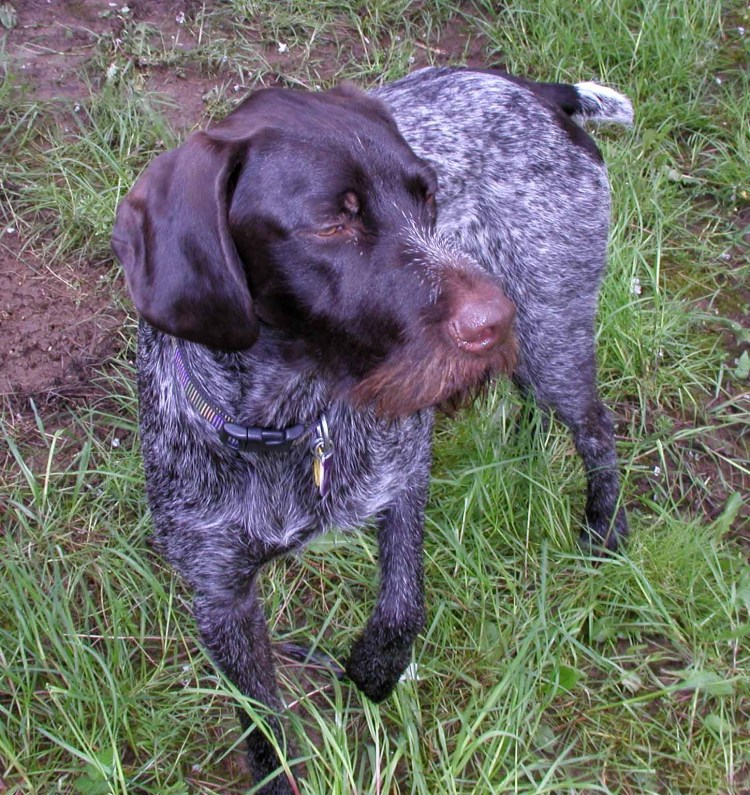 Then: Moby joined our household back in April 2011. He is a very young German Wirehaired Pointer (about 75lbs. of muscle) in need of LOTS of training. Maybe someday we will be having fun in the Agility ring! We are his THIRD home since the breeders in Washington. Poor guy. Needless to say he has plenty of fear aggression issues. He pops up quite frequently in blog entries due to his naughty behavior….