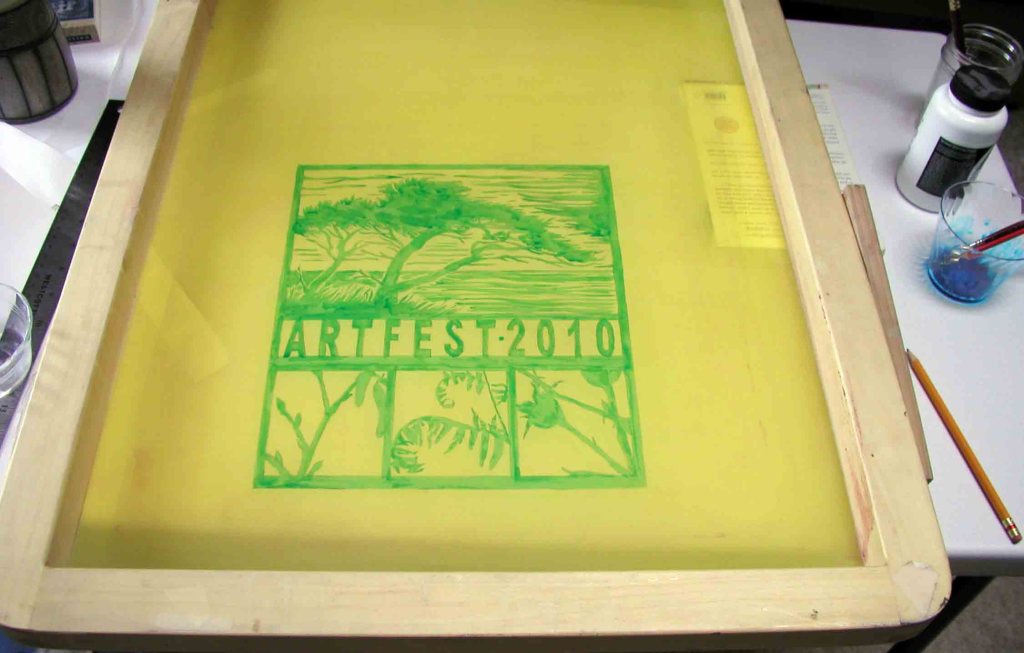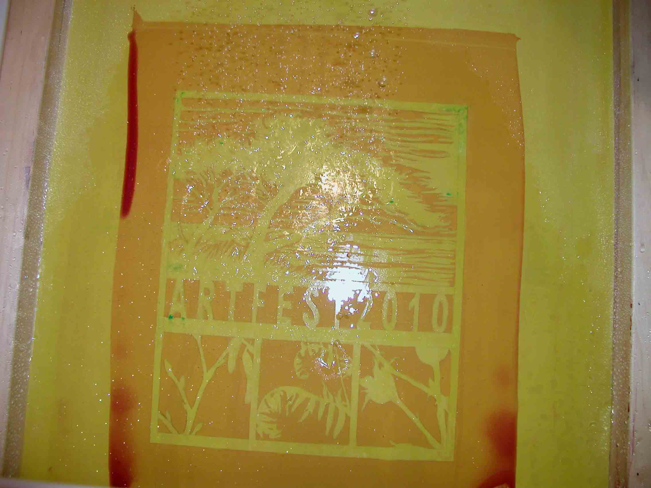 The drawing fluid allows a blocking to occur that can be washed out with cool water and no soap. This will make more sense when the screen filler is applied. Drawing fluid is applied using paint brushes. The image below is screen#2.