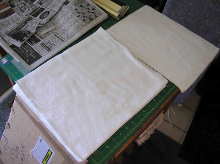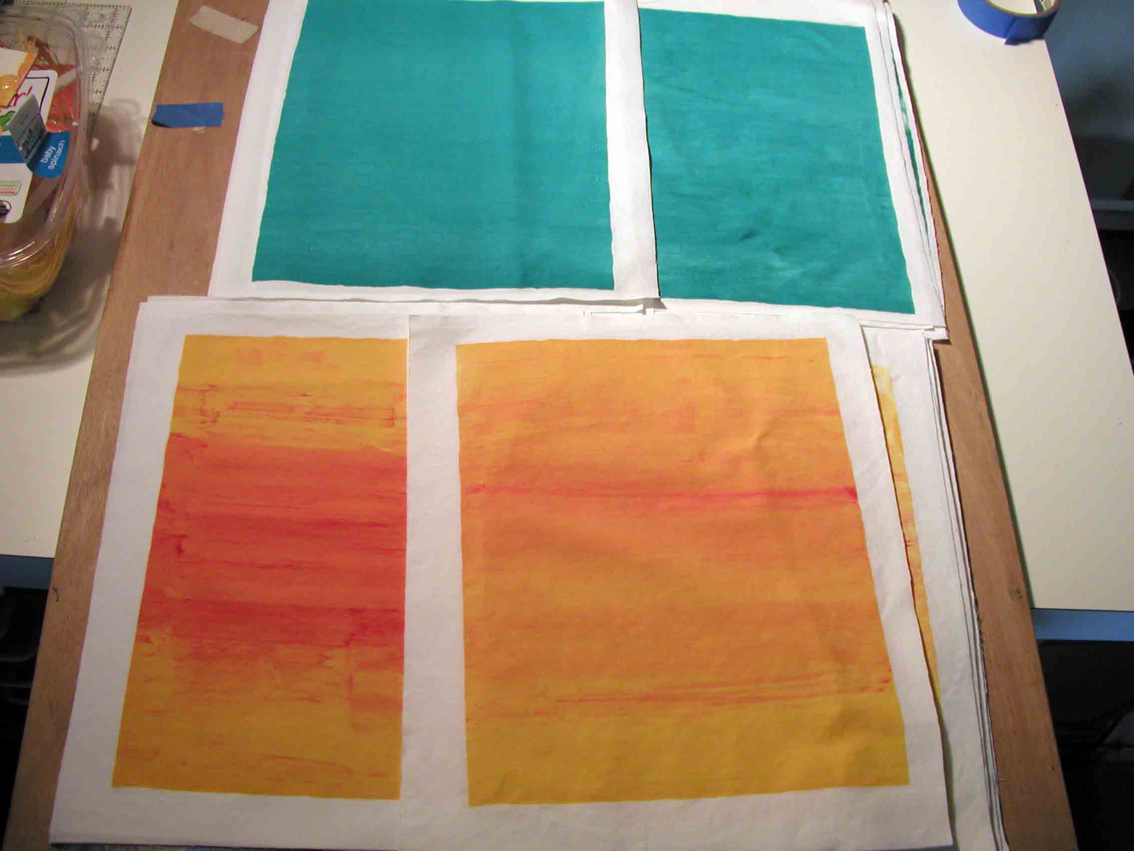 Prior to starting to print, make sure to have plenty of flat space for drying. Fortunately the fabric can be draped over chairs and other items. These have dried and are ready for the second screen.