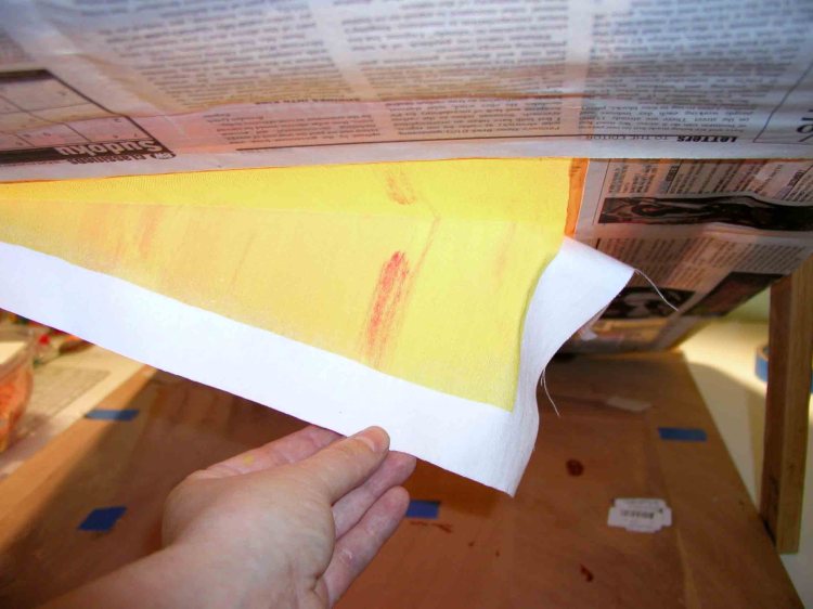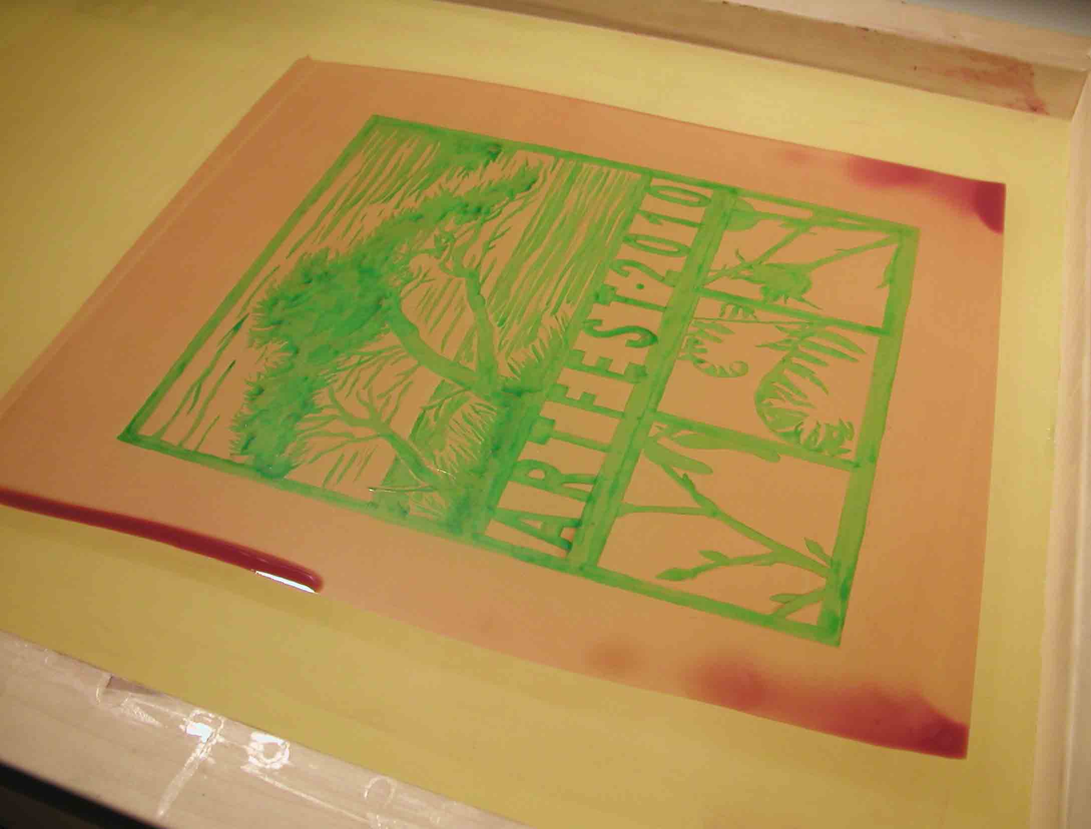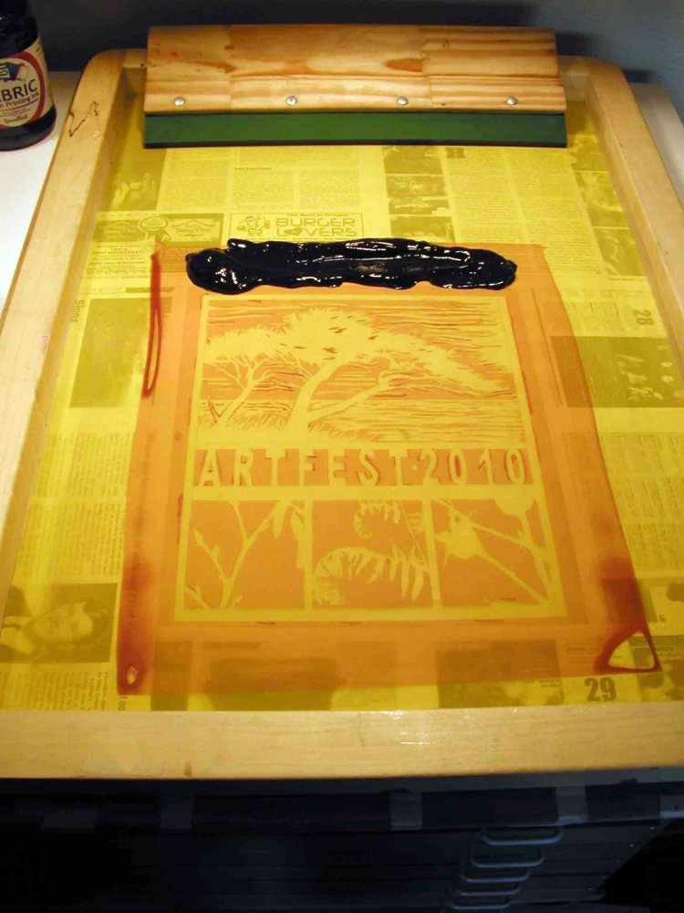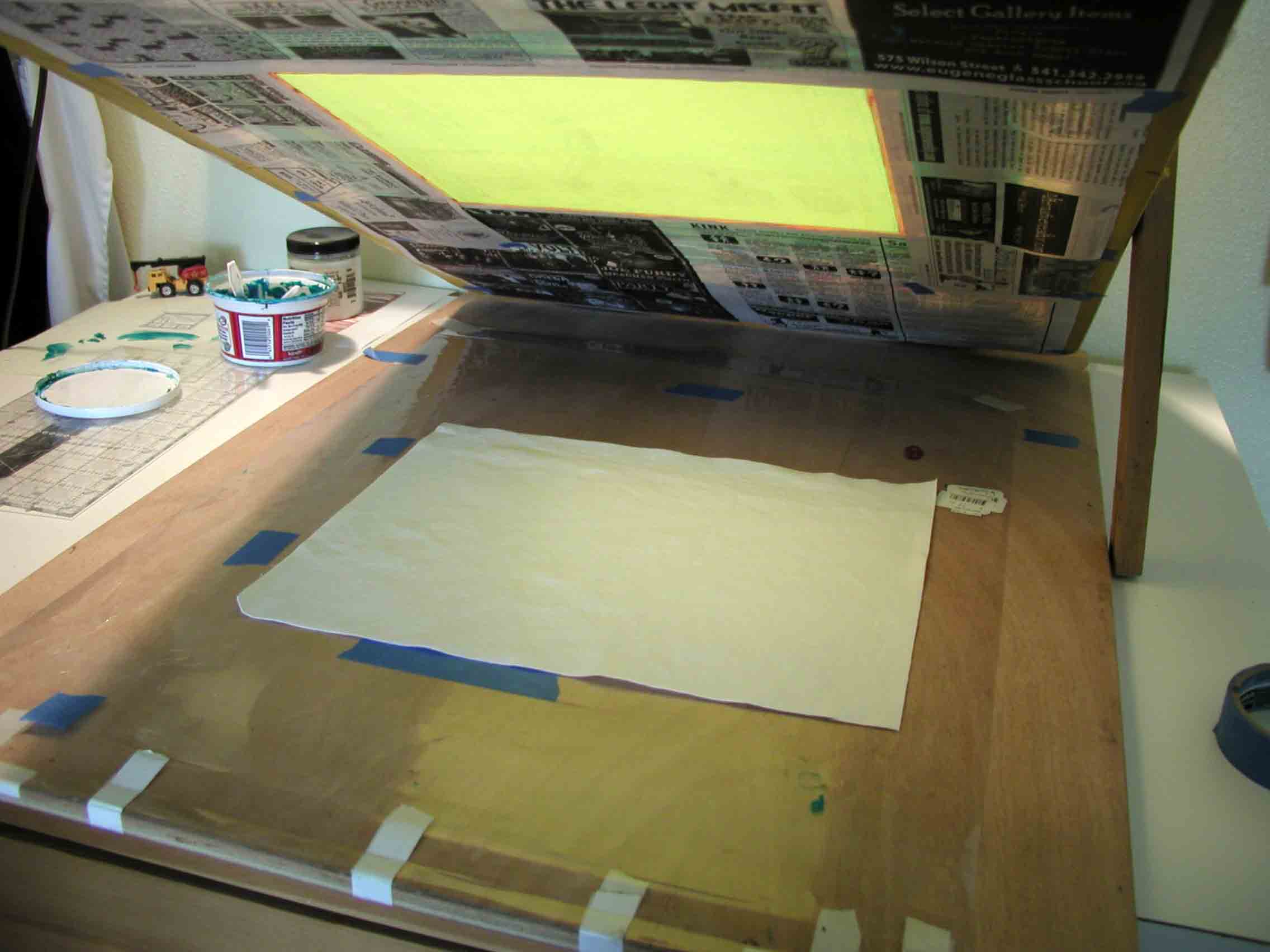 Printing: Screen#1 will be for the background color. Newspaper taped to the back of the screen provides additional ink blocking and helps keep things clean.