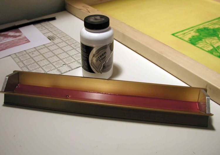 Once the drawing fluid is completely dry, screen filler can be applied over the surface ( the rust red stuff) using a trough. My art buddy Carol Chapel loaned me her trough several years back (and I really do appreciate the loan Carol! Maybe I should actually purchase it from you.) It’s very handy for application of materials, ie: photo emulsion and screen filler. It allows an even coating to be swiped over the screen surface. Image below is the trough loaded up with screen filler.